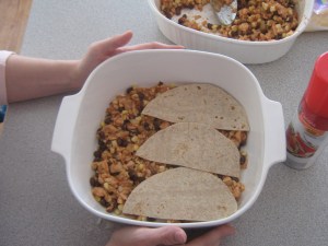 Coat a shallow baking dish with remaining extra-virgin olive oil, about 1 tablespoon oil. Cut the tortillas in half or quarters to make them easy to layer with. Build lasagna in layers of meat and beans, then tortillas, then cheese.